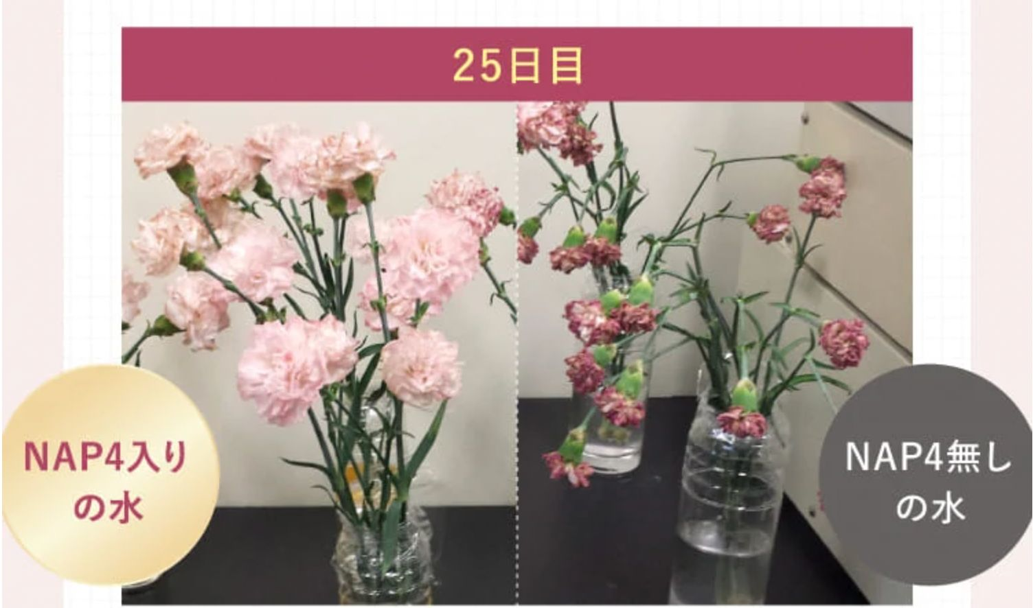 実際に植物で実験したところ、NAP4入りの水につけた花は25日経っても綺麗なまま*だったんです。
